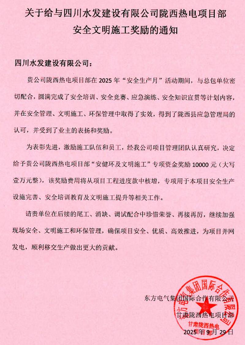 9月29日,由公司承建的甘肃陇西县热电联产(背压式)供热、供汽建设工程项目部再次收到东方电气集团国际合作有限公司的表扬。