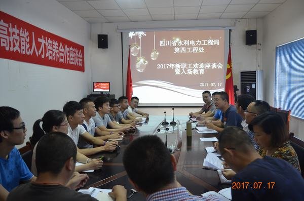 2017年7月17日下午4点,局第四工程处在毗河项目部会议室举行新进大学生入职欢迎座谈会。会议由处总工程师张亮亮主持,副处长罗茂林、工会主席方兵及毗河项目各部门主要负责人参加座谈会。