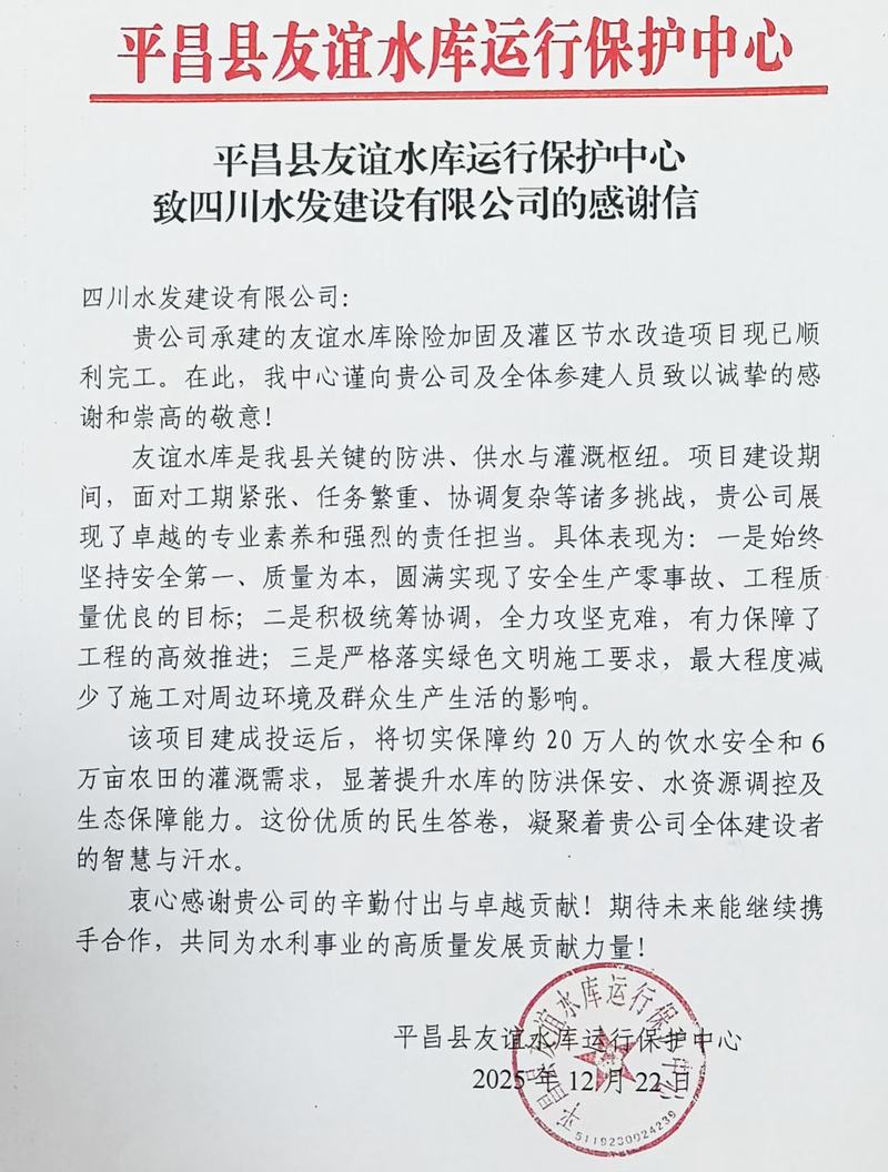 此次获赠锦旗与感谢信,既是对公司项目团队辛勤付出的充分肯定,也是对“川水善建映初心”品牌实力与企业担当的赞誉。公司继续坚守“服务水利事业、保障民生福祉”的国企责任,弘扬铁军精神,为推动区域水利事业发展再立新功。